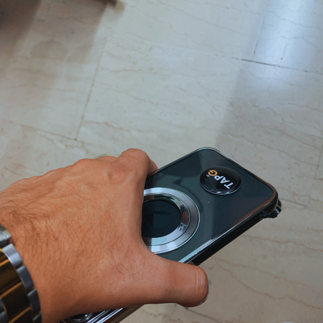 Ο πελάτης ακουμπάει με το κινητό του ένα απο τα προιόντα της TapG